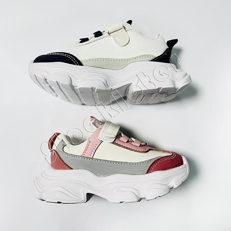 Kids PU sports shoes velcro style running walking sneakers with 7,200 pairs in stock, 2 color patterns and 2 size ranges. Contact us for competitive price.