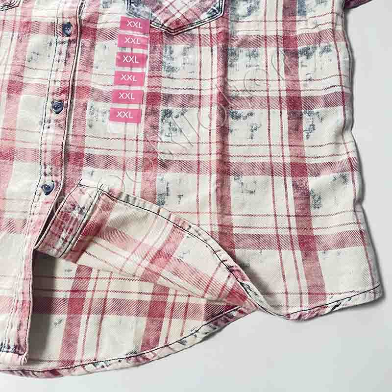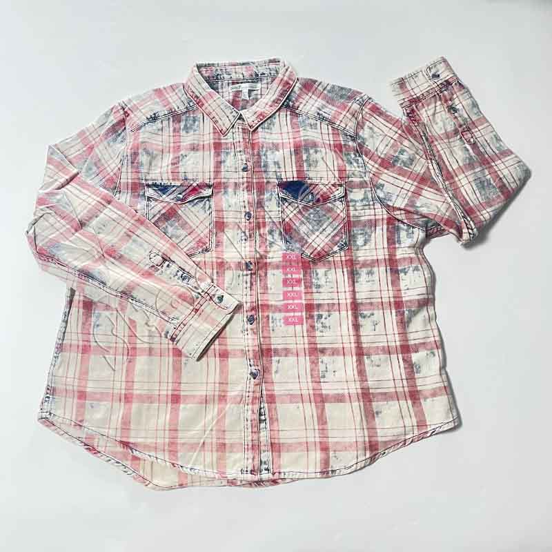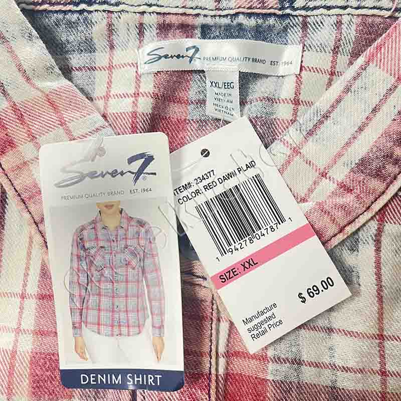 Famous European branded ladies plaid check slim long sleeves denim blouses shirts with 18,842 pcs in stock, 3 color patterns with 5 sizes. High quality. Contact us for fantastic price.
