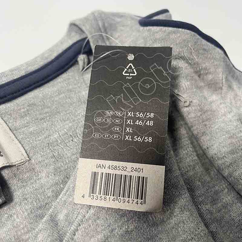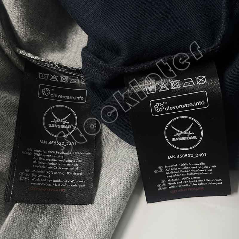 قماش: قماش محبوك بتركيبتين مختلفتين.اللون الرمادي: 90% قطن، 10% فيسكوز. اللون الكحلي: 100% قطن. الوزن: 220-230 غرام/متر مربع.