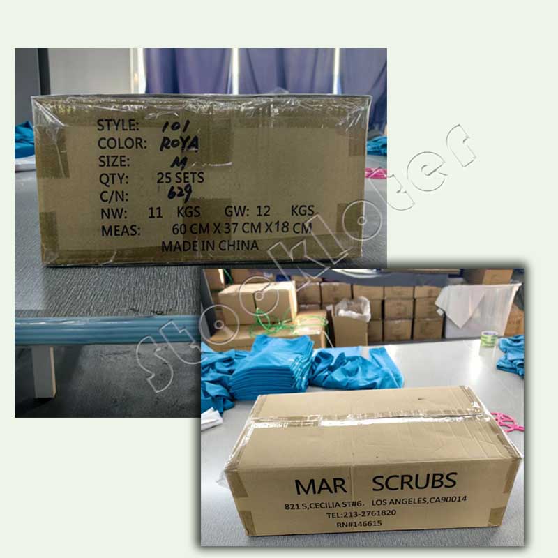 ملابس طبية بإجمالي 16,435 قطعة، موديل نسائي 10 ألوان 4 مقاسات، موديل رجالي 7 ألوان 5 مقاسات، 31 متر مكعب
